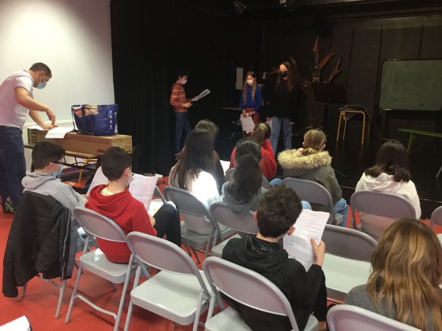 Chaque jeudi de 12h45 à 13h30, sous la direction de Sébastien Burel, professeur d’espagnol, une cohorte de 20 élèves volontaires se rend à la salle de théâtre du collège pour représenter les pièces imaginées et écrites préalablement.