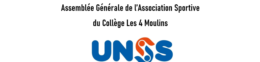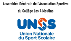 A.G. de l’A.S. du collège Les 4 Moulins Lundi 30 septembre de 12h40 à 13h15 en salle de réunion. Réunion ouverte à tous les élèves licenciés à l’U.N.S.S., leurs parents et au personnel du collège. Ordre du jour : bilan sportif 2023/2024, bilan financier, projets pour 2024/2025, élection du (…)